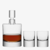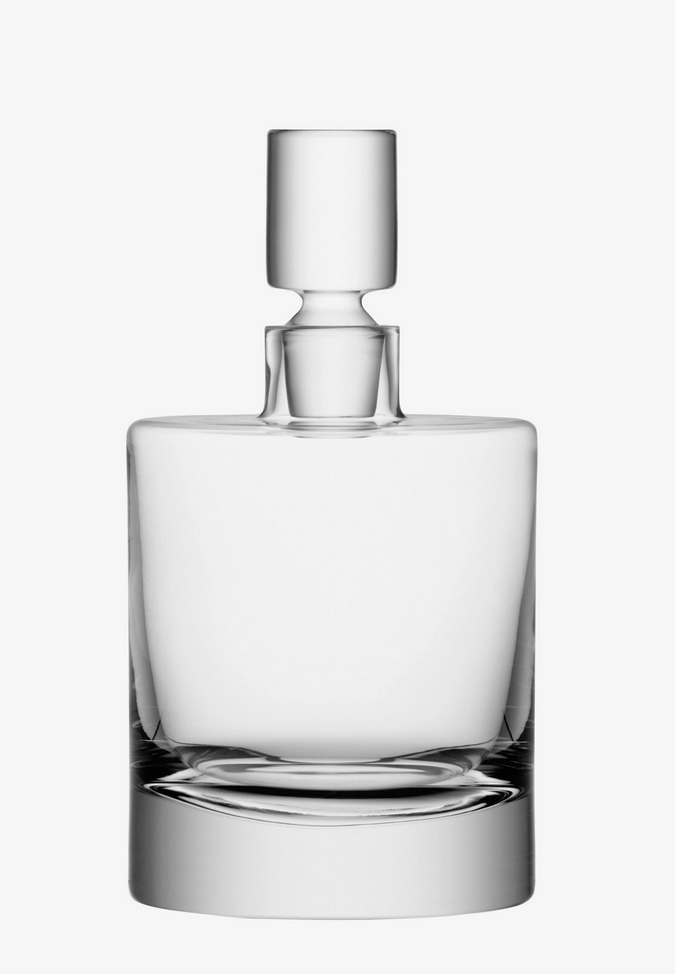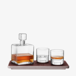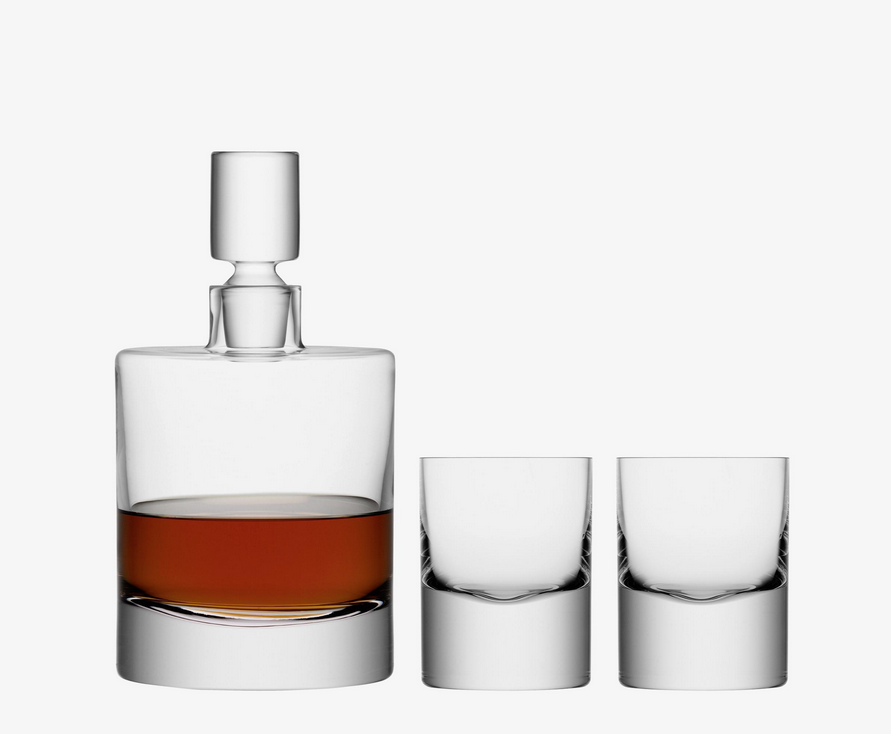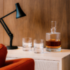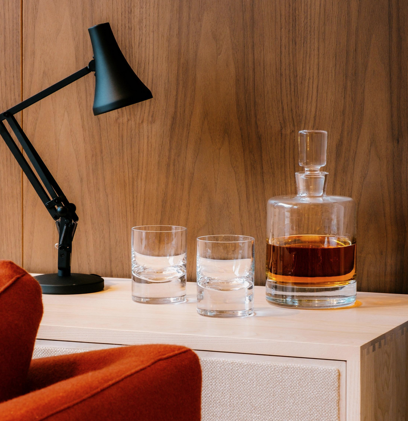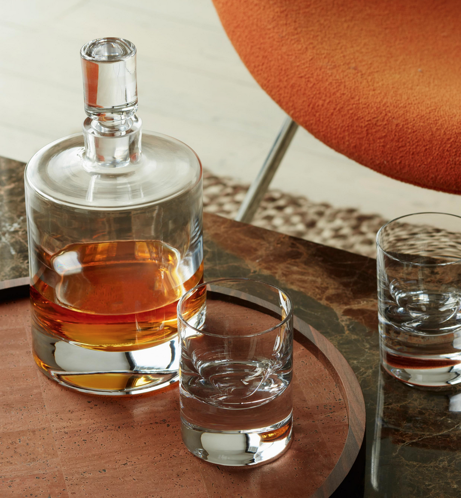 This combination set includes a pair of fine-walled tumblers and a decanter, mouth blown by master glassblowers. Expert craftsmanship is required to shape and grind the decanter’s stopper by hand.