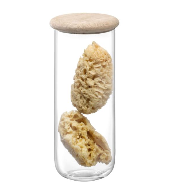 A tall mouth-blown glass container with a wooden lid, made from FSC-certified natural oak. Suitable for storage and display in the kitchen, bathroom, bedroom, or office.