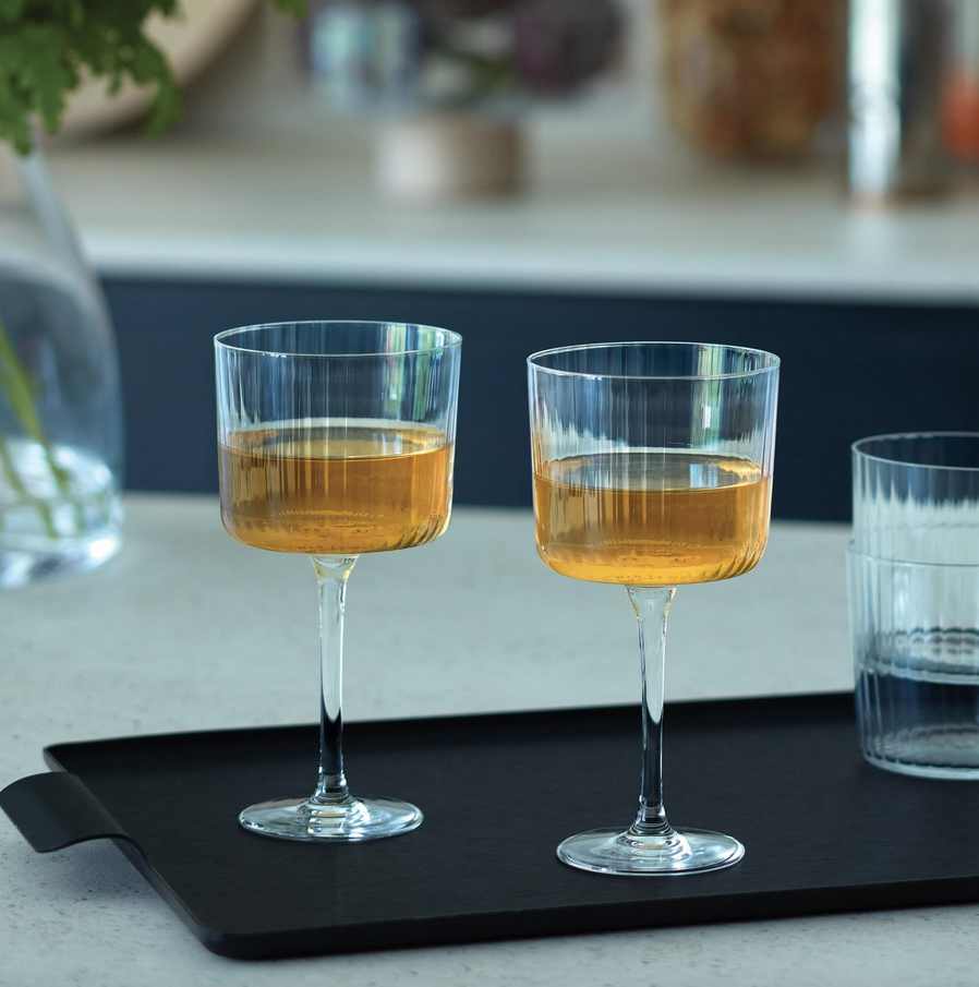 A set of four wine glasses with fine textured walls, a modern shape and casual stems. For serving red, white or rosé wine.