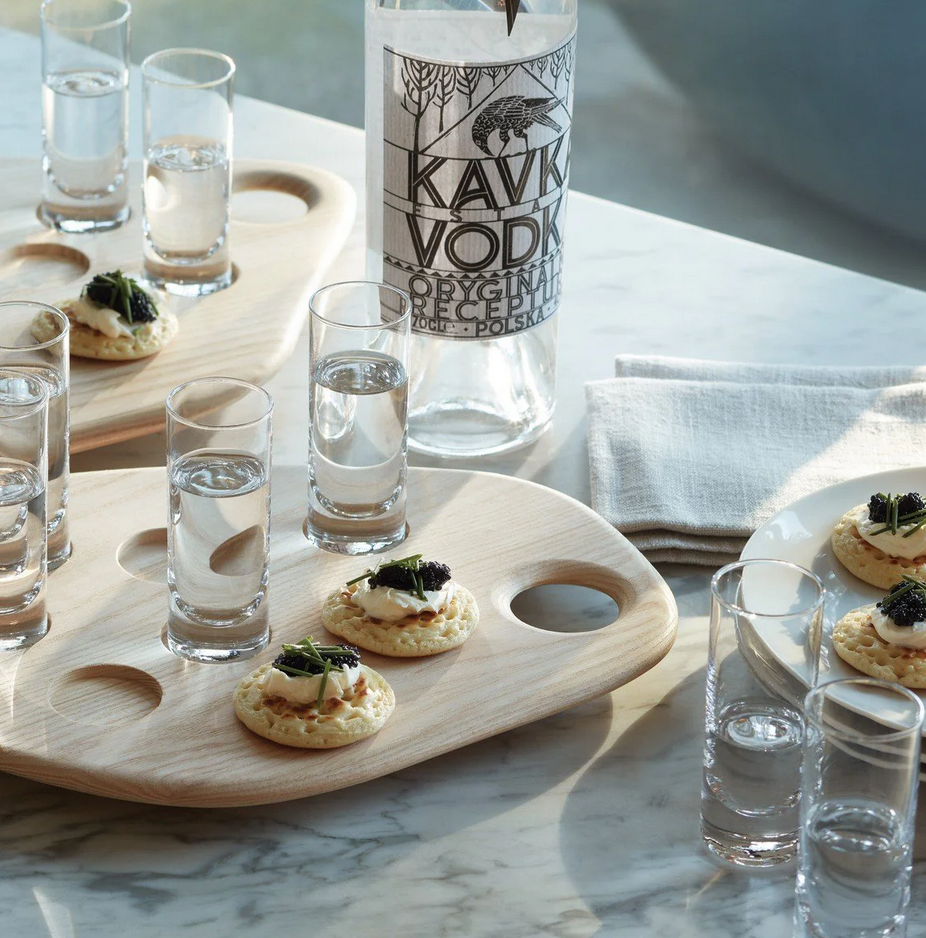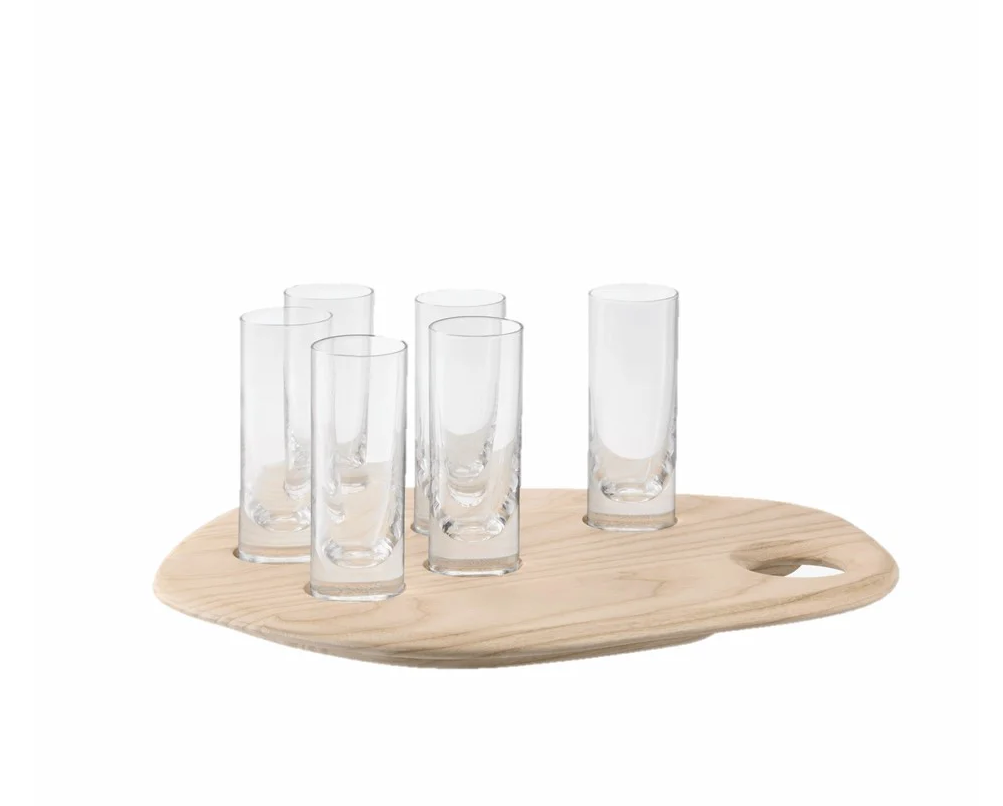 A contemporary mixed material design for serving shots. The cylindrical shot glasses sit on an organically-shaped natural ash board with a thumb hole that is designed for ease of carrying.