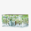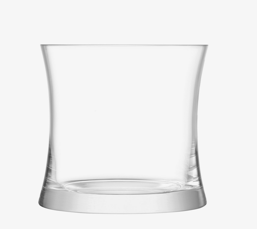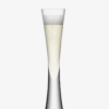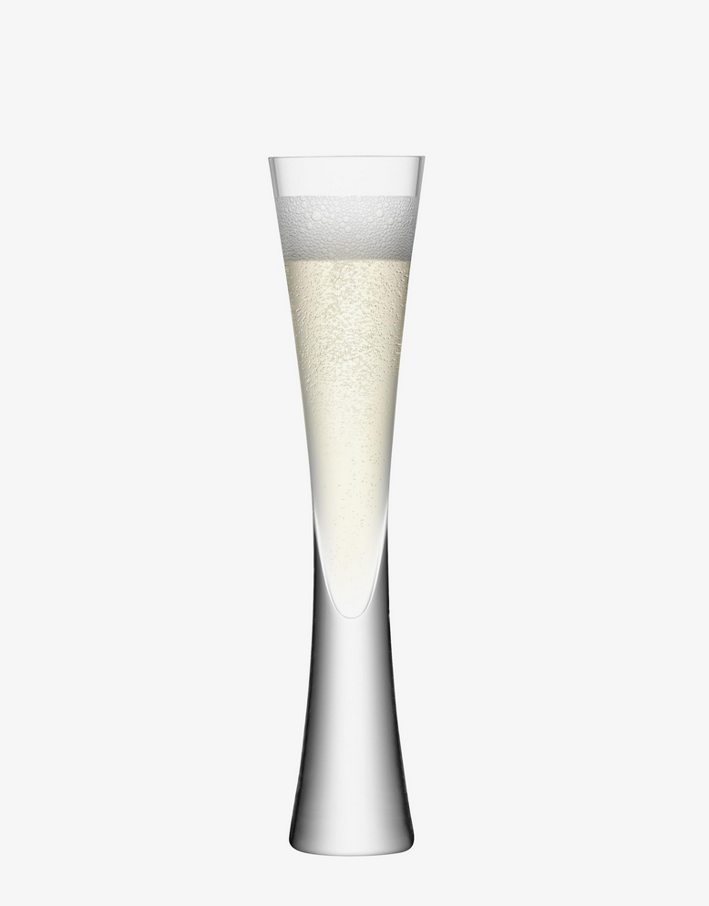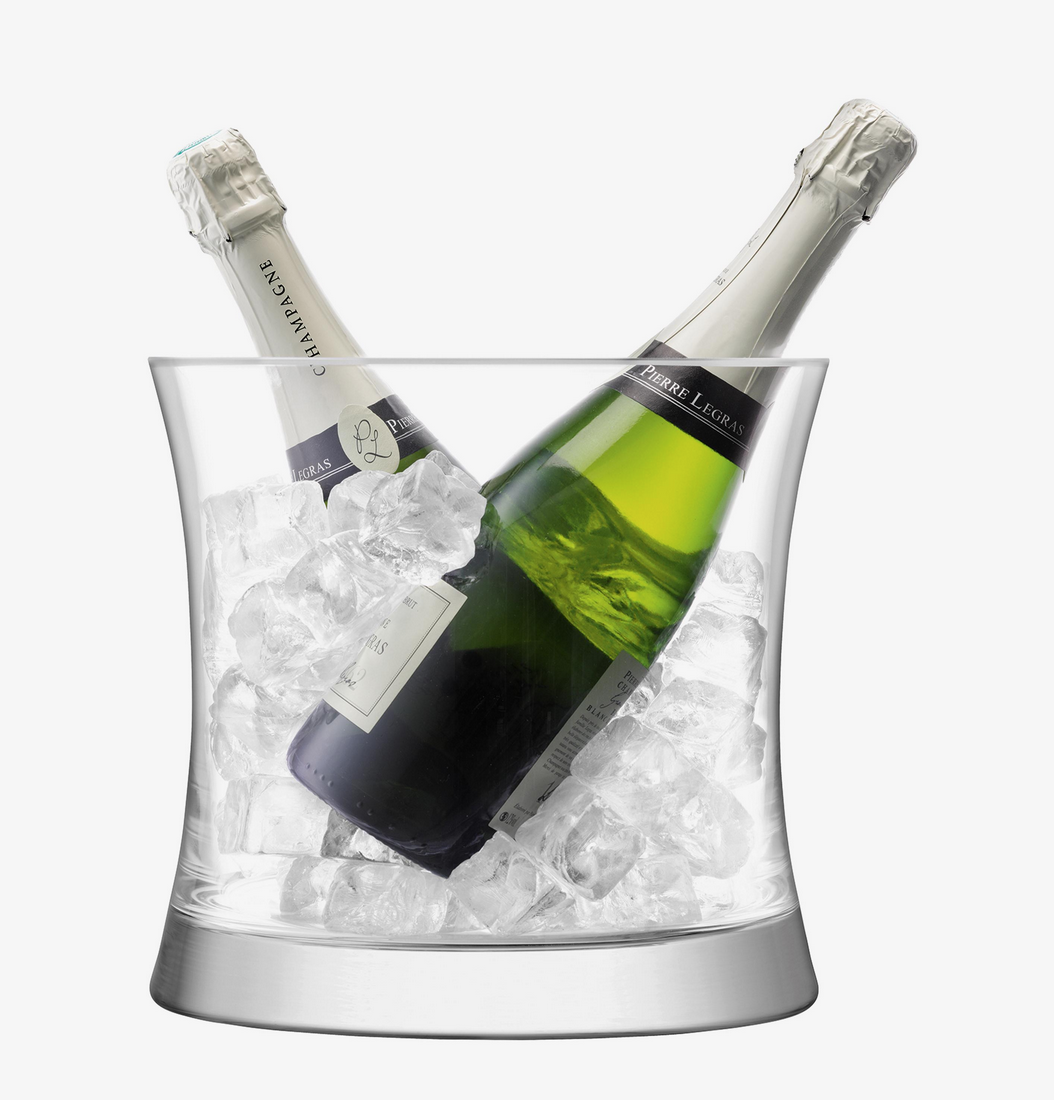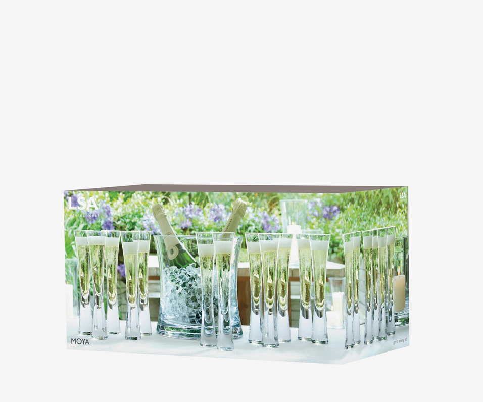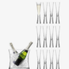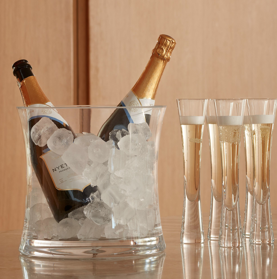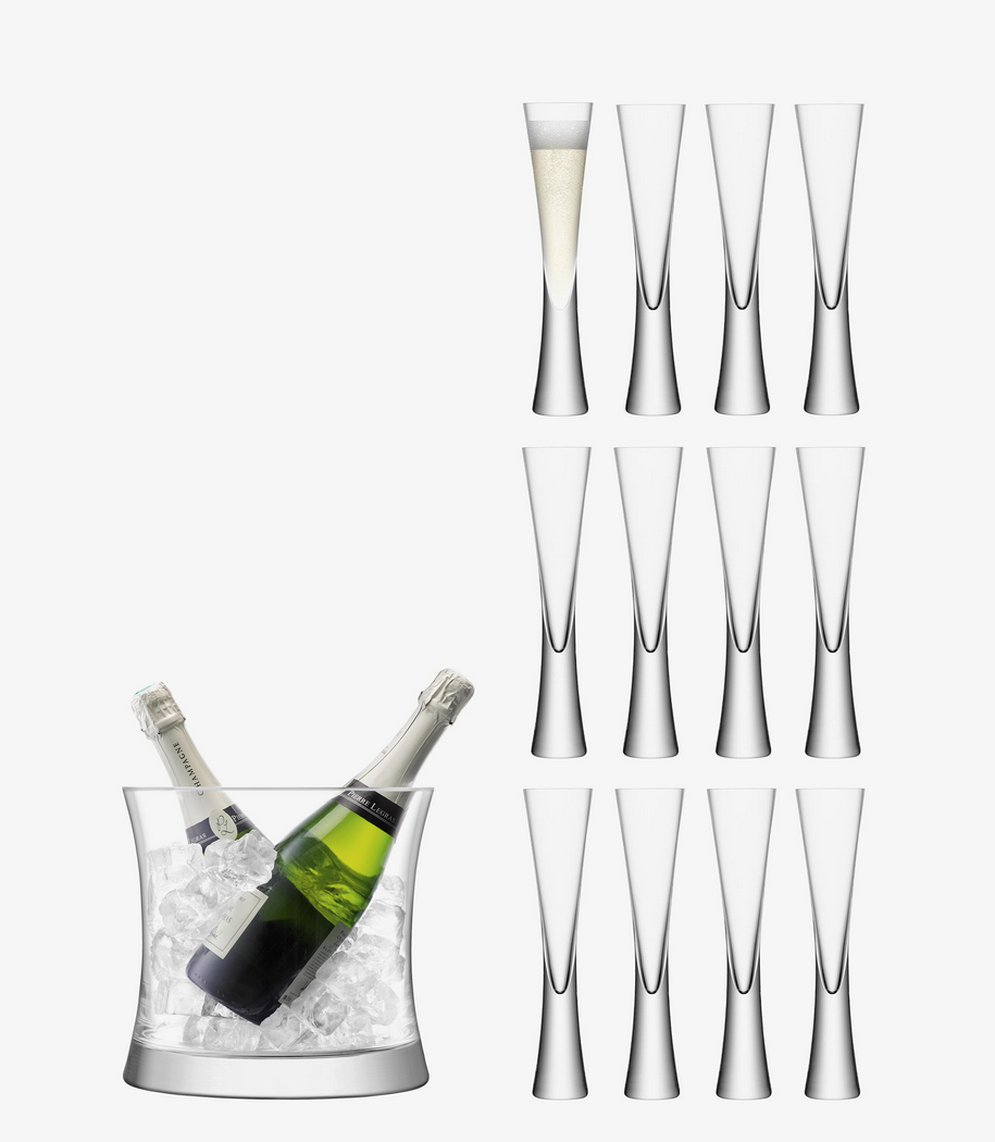A mouth-blown glass champagne serving set. Includes 12 flutes and a large ice bucket designed for two bottles. Each flute’s fine bowl and thick, flared stem is mouth blown as one piece of glass. The ice bucket has a complementary curved design, thick walls and heavy base.