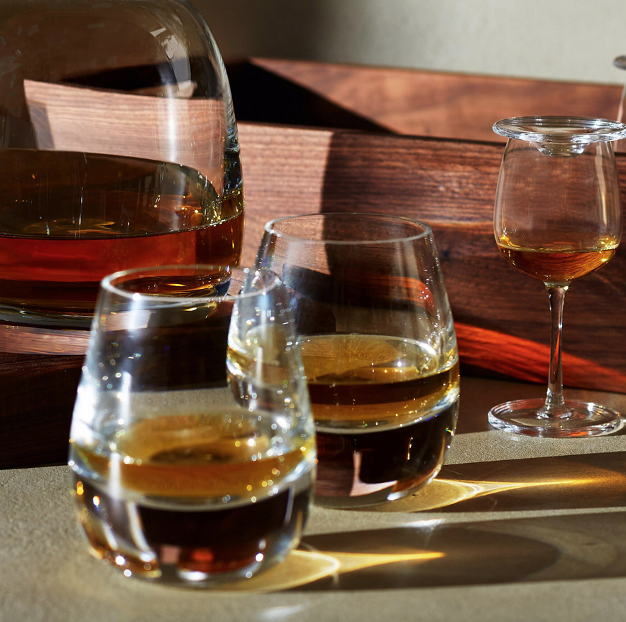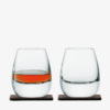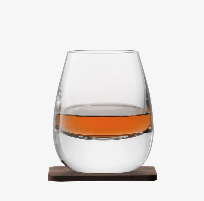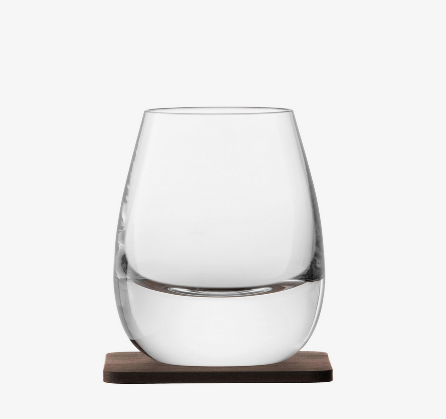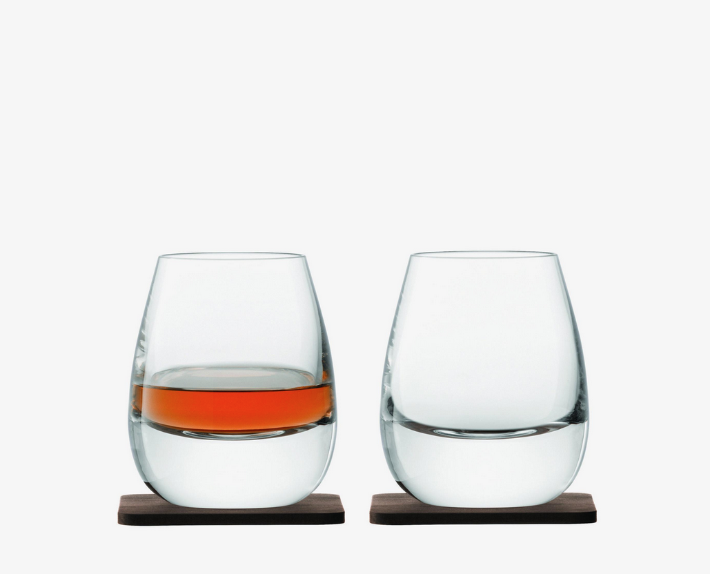 Set of two heavy-based whisky glasses with a rounded shape. Paired with solid walnut coasters. Expert craftsmanship is required to mouth blow and finish each glass by hand. A modern interpretation of traditional whisky drinkware.