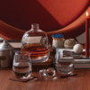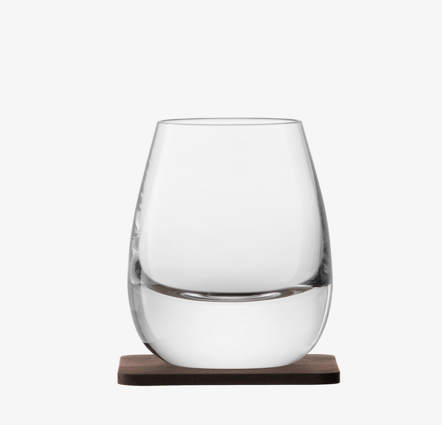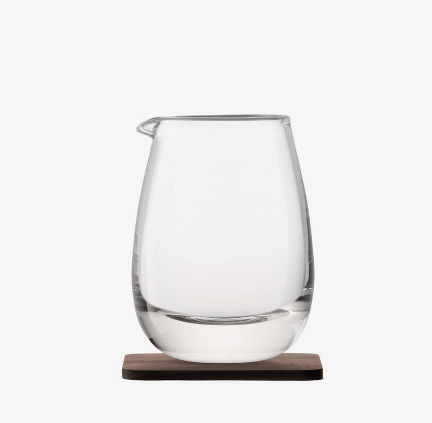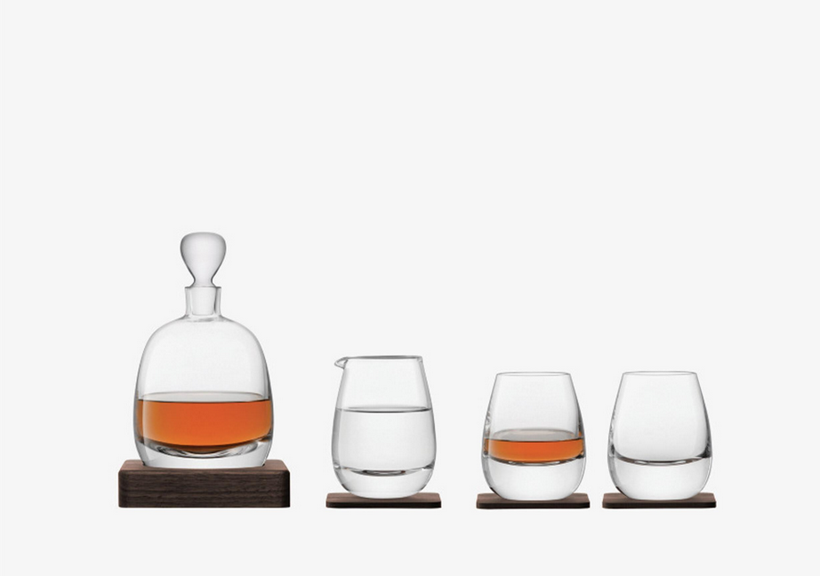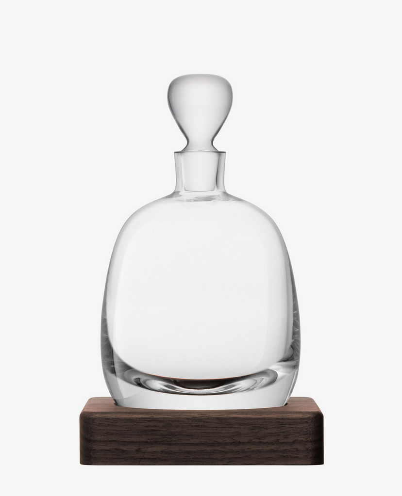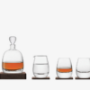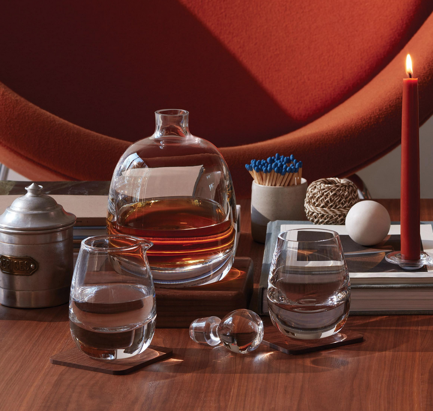This combination set includes a decanter with walnut base, water jug with coaster, and two tumblers with coasters. Expert craftsmanship is required to mouth blow the glass and grind the stopper by hand.